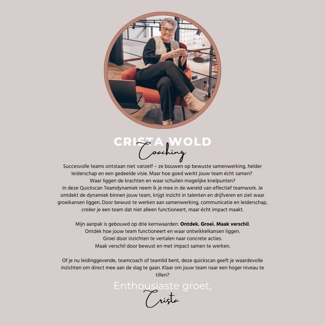 In deze Quickscan Teamdynamiek neem ik je mee in de wereld van effectief teamwork. Je ontdekt de dynamiek binnen jouw team, krijgt inzicht in talenten en drijfveren en ziet waar groeikansen liggen. Door bewust te werken aan samenwerking, communicatie en leiderschap, creëer je een team dat niet alleen functioneert, maar écht impact maakt.